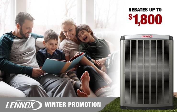 Rebate Disclaimer: Rebate requires purchase of qualifying items between January 19, 2026 and February 13, 2026 from a participating Lennox® dealer. Contact your local participating Lennox® dealer for promotion details. Qualifying items must be installed by February 20, 2026. This offer applies to residential installations only. Rebate claims must be submitted (with the Dealer’s invoice to the homeowner listing all models and serial numbers) to www.lennoxconsumerrebates.com no later than March 22, 2026 11:59:59 p.m. ET. Rebate is paid in the form of a Lennox Prepaid Mastercard®. Use your card anywhere Mastercard is accepted. This card is issued by The Bancorp Bank, N.A., pursuant to license by Mastercard International. Mastercard and the circles design are registered trademarks of Mastercard International Incorporated. The Bancorp Bank, N.A.; Member FDIC. This is not a gift card. This card is issued for loyalty, award or promotional purposes. Please note that prepaid cards are subject to expiration, so pay close attention to the expiration date of the card. Conditions apply. See www.lennox.com/terms-and-conditions for complete terms and conditions.